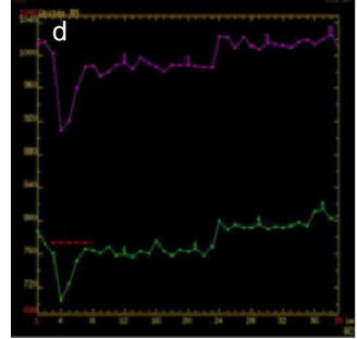 c, d : Cartographie du rCBV et courbes de perfusion sur la lésion « rouge » et sur le parenchyme sain « vert »: élévation importante de la valeur du rCBV reflétant une hypervascularisation de la tumeur.