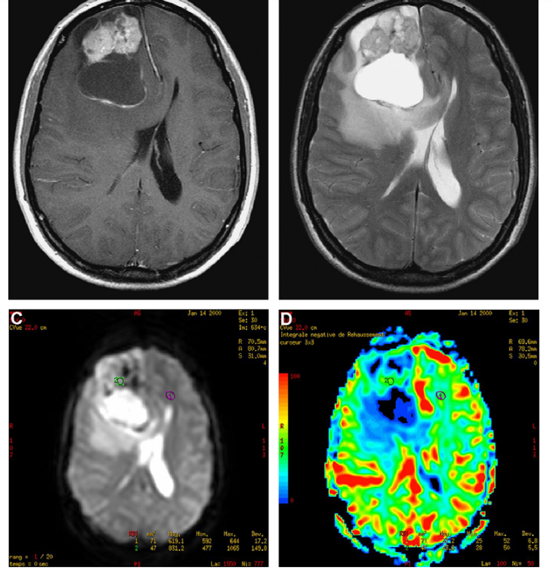 D : cartographie rCBV ne montrant pas d’anomalies de la perfusion dans la zone tumorale solide prenant le contraste.