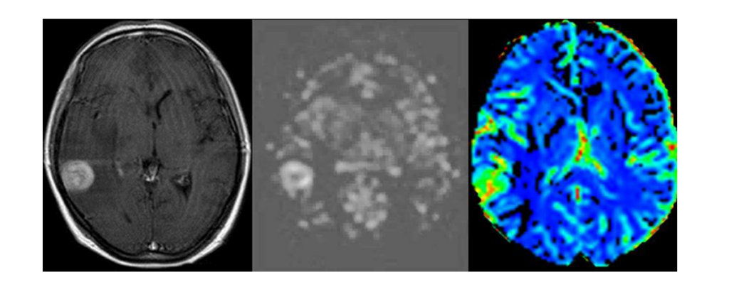 - Sur la carte ASL, la masse présente une haute intensité de signal.