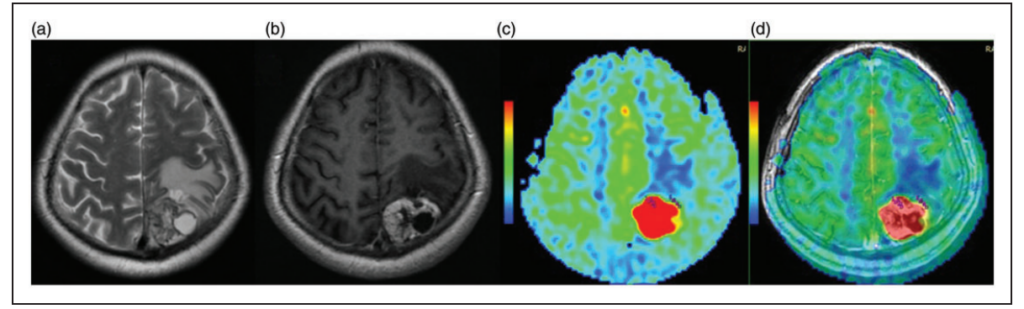 (c) Carte colorée ASL démontrant une zone d’hypervascularité (valeur élevée de débit sanguin cérébral, zone rouge) dans la tumeur.