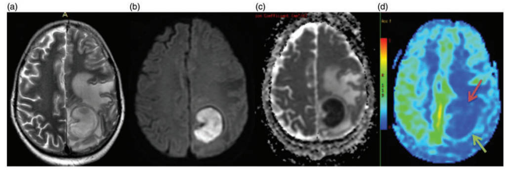 (d) Sur l’IRM de perfusion la lésion montre un faible débit sanguin cérébral (flèche).